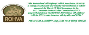 The Recreational Off-Highway Vehicle Association (ROHVA) is calling on enthusiasts and industry representatives to submit comments by March 15, 2010 in response to the U.S. Consumer Product Safety Commission (CPSC) proposed mandatory standards for Recreational Off-Highway Vehicles (ROVs), also known as side-by-sides and UTVs.
