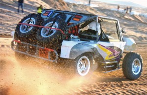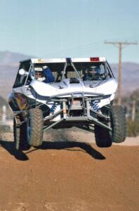 the pits for the crew to check things over. Turner reported that the rear suspension seemed pretty soft, so the crew make a quick adjustment to stiffen the rear shocks and added a splash of fuel. Gas mileage was another unknown, and with just a 10 gallon tank, the crew was nervous about being able to make the full loop on one tank of fuel. Fortunately the SR-1 engine proved to get much better mileage than anticipated and fuel range turned out to not be an issue. The car was checked over and proved to be in great shape, so Turner roared out of the remote pit to tackle the remaining 50 miles of the loop. Unfortunately, the rocky terrain took its toll on the tires, and Turner ended up using both spares on board after experiencing flats on different sections of the course. By the time Turner reached the Parker Python at the end of the first lap, he had climbed his way from the back of the pack to sixth place! Unfortunately, he was also out of spares and running on two flat tires when he got to the pits. The Python also claimed a right rear shock, forcing a lengthy stop where the crew frantically repaired the damaged shock, changed the two flats, and reloaded the tire rack with fresh spares. Determined to finish the race, Turner decided to take it easy on the second lap and hopefully nurse the repaired but still damaged rear shock to the finish line. Unfortunately, 7 miles into the second lap, the damaged shock gave up again and a second attempt to repair it proved ineffective as well. The break forced Turner out of the race for good, but the strong showing at their first desert race kept the team’s spirits high and gave them the confidence needed to be contenders in long-distance racing.