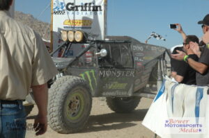 Gilbert, AZ (February 13, 2011)– The 2011 King of the Hammers race has once again come and gone, and once again, Shannon Campbell of Team Monster Energy/Campbell Racing is the King. No stranger to holding the title, Shannon won the first King of the Hammers race in 2008 in a dominating fashion and has returned to the desert ready for the challenge in front of him and hungry for the win. Accustomed to starting in the back of the pack, Shannon knew he had to demand the top performance out of his car to get to the front of the group before they reached the first section of rock crawling, Outer Limits, that has always had such a high attrition rate. He proceeded to punish his equipment and grind down until he attained his goal; which proved to be a significant contribution to his victory. Shannon’s efforts along with strong support from his various sponsors and support crew allowed him to claw his way from his 62nd starting position, to a first place finish 6 hours and 11 minutes later. Right from the start, Shannon was on a mission for winning, passing half the field by check point one and was in the lead before the start of his second lap. In true Campbell fashion, the race was full of make it or break it situations, a full on edge of your seat race from start to finish. One of the most exciting moments was the pass on Jason Scherer for the physical lead. After that initial battle, the two chased each other in the rocks and desert for the next 40 miles until Scherer eventually suffered mechanical failure. Shannon started having some issues when a bent driveshaft caused him to stay below 50mph and with a 14 minute lead, Shannon’s Dad, Don Campbell, a racing legend himself, told him,” back it off and bring it home.” It’s been said that racing requires the minimum amount of skill and the maximum amount of courage, but Shannon and the rest of the racers will agree that the King of the Hammers requires skill, courage, and grit, accompanied with dedicated partnerships to get to the finish line. As Shannon crawled out of his car and shook the dust off, the King of the Hammers crew handed him the trophy and that’s when the reality of the race had finally set in. When asked how he made such a victorious run to the finish line, Shannon said,” I’m just the monkey behind the wheel, my team and sponsors made this win possible.”