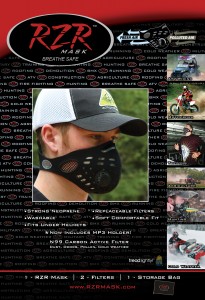 “That’s why the neoprene RZR Mask (www.rzrmask.com) is such a hot item. It has carbon-activated, replaceable filters that filter out 99.9 percent of all airborne particles (both gasses and solids), it is comfortable and sporty, and it fits easily inside a helmet.”
