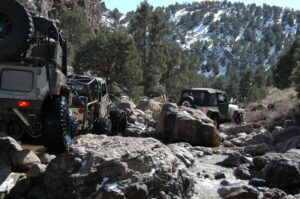 The Reno weather was perfect for a day on the trails. Blue sky, fluffy white clouds and not much wind. With snow the weekend prior, some of the mountain passes were extra muddy, snowy and slippery, but nothing this group of experienced drivers couldn’t handle. A full day led the group to a lookout over Reno, a Petroglyph rock garden, a delightful glance at brand new colts and through one of the hardest rocky canyons known in the area: Bronco Canyon. Normally a dry canyon, the water was deep enough to engulf 33” tires. With the exception of a broken tie rod at the last obstacle, the most challenging rocky section didn’t even phase this group. After a long day on the trail, the now group of friends headed to Virginia City for a bit of social time and story telling about the day. These are the reasons why we love our off-road sport so much.