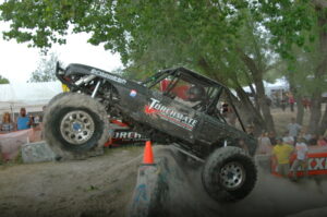 Next up was Justin Hall who made a valiant effort at the climb during the competition minutes. He started off with an attempt run and then progressively got more and more aggressive with the climb. His Mom, Dad and Sister in the wings, Justin flew straight up into the air 30ft and then would land back down on his wheels, and try again. On the eighth or so try he made it! The crowd went wild with the accomplishment running to the vehicle to congratulate…but he still had to focus to finish the course. He finished, climbed out of the buggy and stood on the tires in a winners pose.