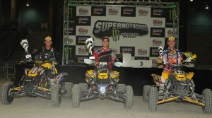 In front of 45,000 fans, Can-Am X-Team Pro ATV racer Richard Pelchat topped an all-Can-Am DS 450 podium in winning the ATV portion of the Montreal Supermotocross event held at Olympic Stadium in Quebec, Canada. Fellow Can-Am racer Mark Holz also recorded a class victory, piloting the No. 673 Holz Racing / Motoworks / Can-Am Commander 1000 X to an historic win in the inaugural Side-By-Side class event. Can-Am ATV racers Cody Miller, reigning 2010 NEATV-MX Champion, and John Natalie, 2011 AMA ATV MX Champion, joined Pelchat on the podium.