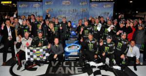 Celebrating Monster Energy’s 10th anniversary in style, Kurt Busch drifted his No. 54 Monster Energy Toyota to his first victory under the newly formed Kyle Busch Motorsports, owned by his brother, Kyle. Kurt Busch robbed Denny Hamlin of the checkered flag by 0.062 seconds, sliding sideways through the finish in one of the most exciting final laps in NASCAR history at Richmond International Raceway.